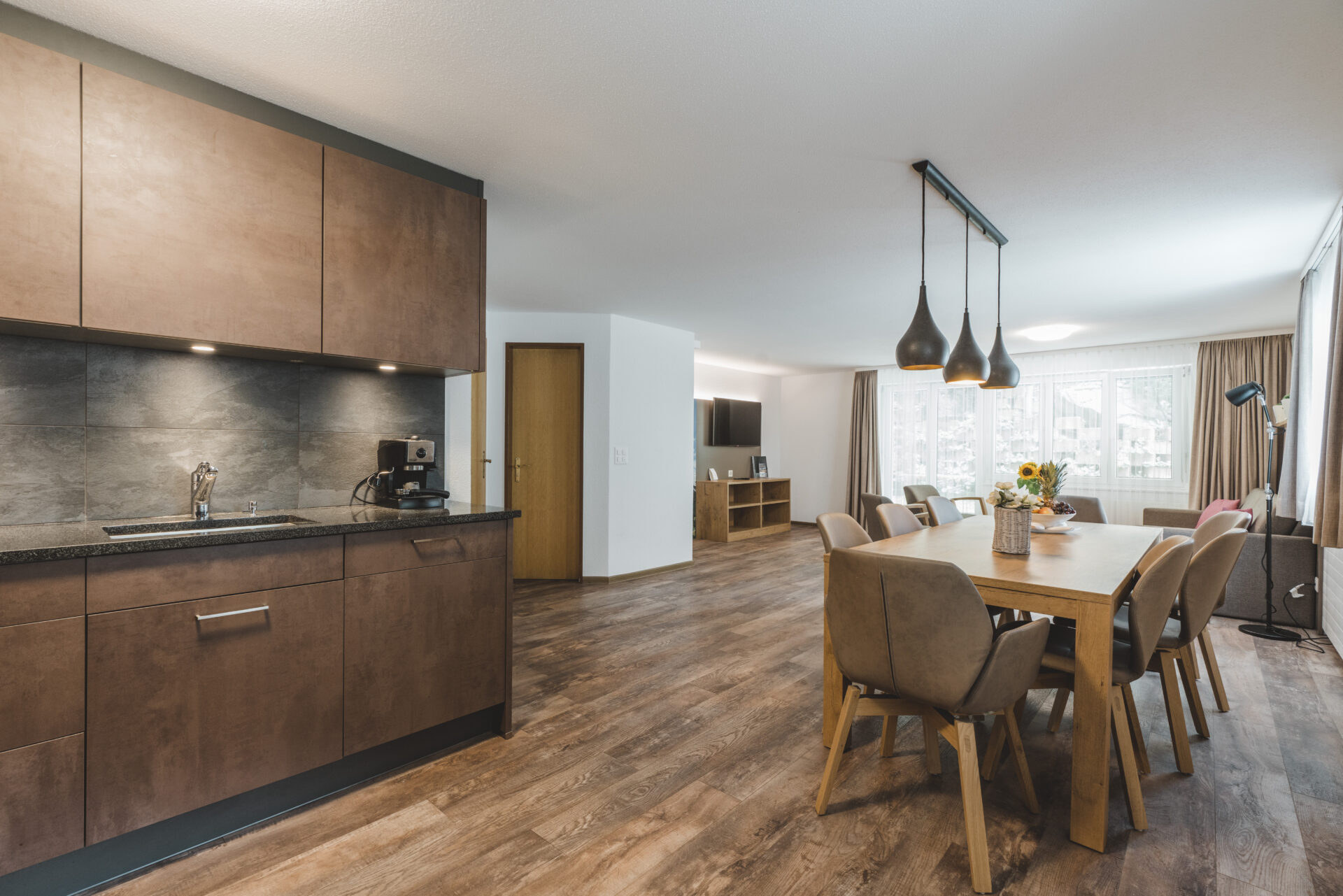 Die 100 m² grosse Wohnung hat zwei Etagen mit drei Schlafzimmern im ersten Stock und dem Wohn- und Esszimmer im Erdgeschoss. Jedes Schlafzimmer hat ein eigenes Bad und es gibt ein zusätzliches Tages-WC neben dem Wohnzimmer. Geniessen Sie Ihren Urlaub mit Freunden oder Familie und versammeln Sie sich im geräumigen Wohnzimmer mit voll ausgestatteter offener Küche, einem grossen Esstisch und einer Sitzecke. Die Terrasse bietet Bergblick und direkte Sicht auf das weltberühmte Matterhorn.