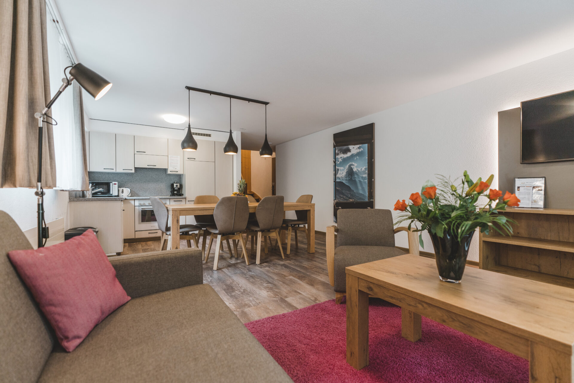 Versammeln Sie Ihre Lieben in dem grosszügigen Wohnzimmer mit einer Sitzecke. Ausserdem gibt es eine voll ausgestattete offene Küche und einen grossen Esstisch, an dem Sie gemeinsam herrliche, hausgemachte Mahlzeiten geniessen können. Von der Terrasse aus können Sie die schöne Zermatter Berglandschaft mit dem weltberühmten Matterhorn sehen.