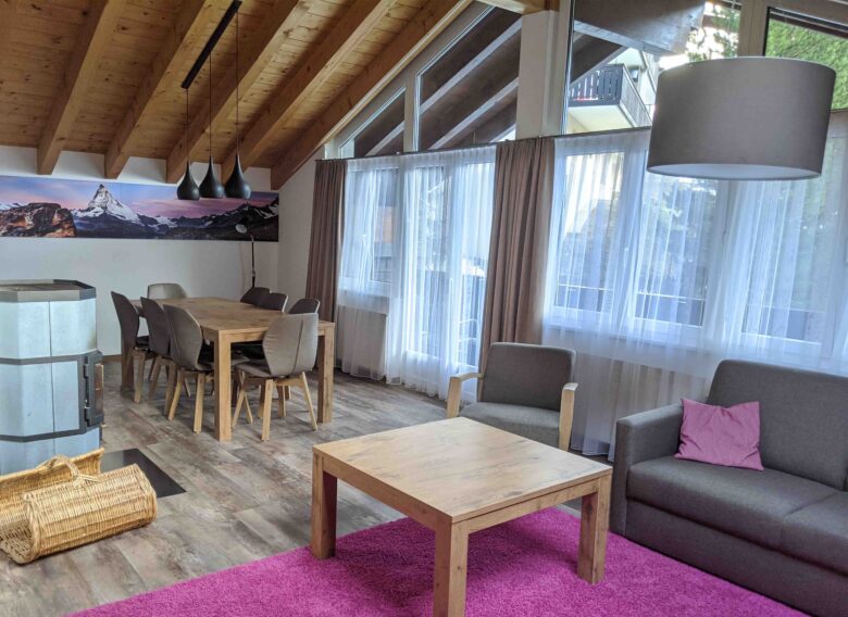 Die helle Maisonette-Wohnung bietet drei Doppelzimmer, jedes mit eigenem Bad und Balkon im ersten Stock. Das Wohnzimmer im Erdgeschoss ist mit einer Küche und einem großen Esstisch ausgestattet. Die Terrasse bietet Bergblick mit einem indirekten Blick auf das Matterhorn.